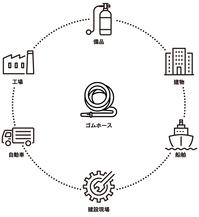 水や燃料といった液体を送るにも、空気やガスといった気体を送るにも、 さらには、地中の電線や光ファイバーを通す道としてもゴムホースが使われています。 また、工場や駅などの施設にも、乗り物や工業用機械、家電製品にも使われており、 ゴムホースは私たちの暮らしに必須の機能部品として、重宝されています。